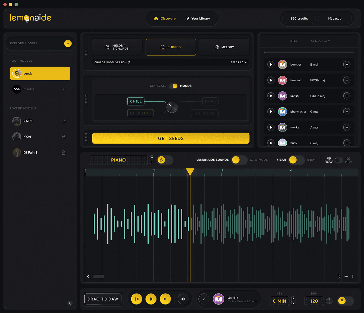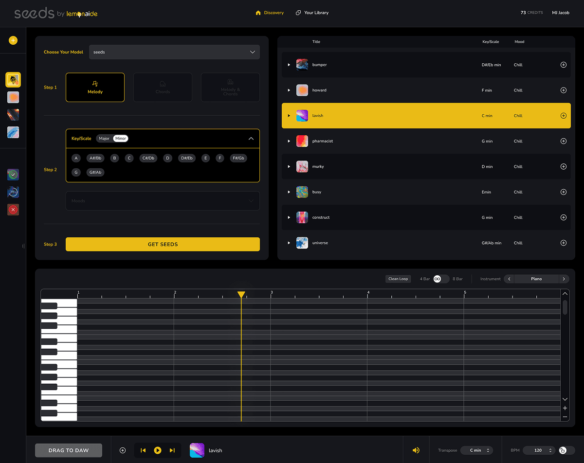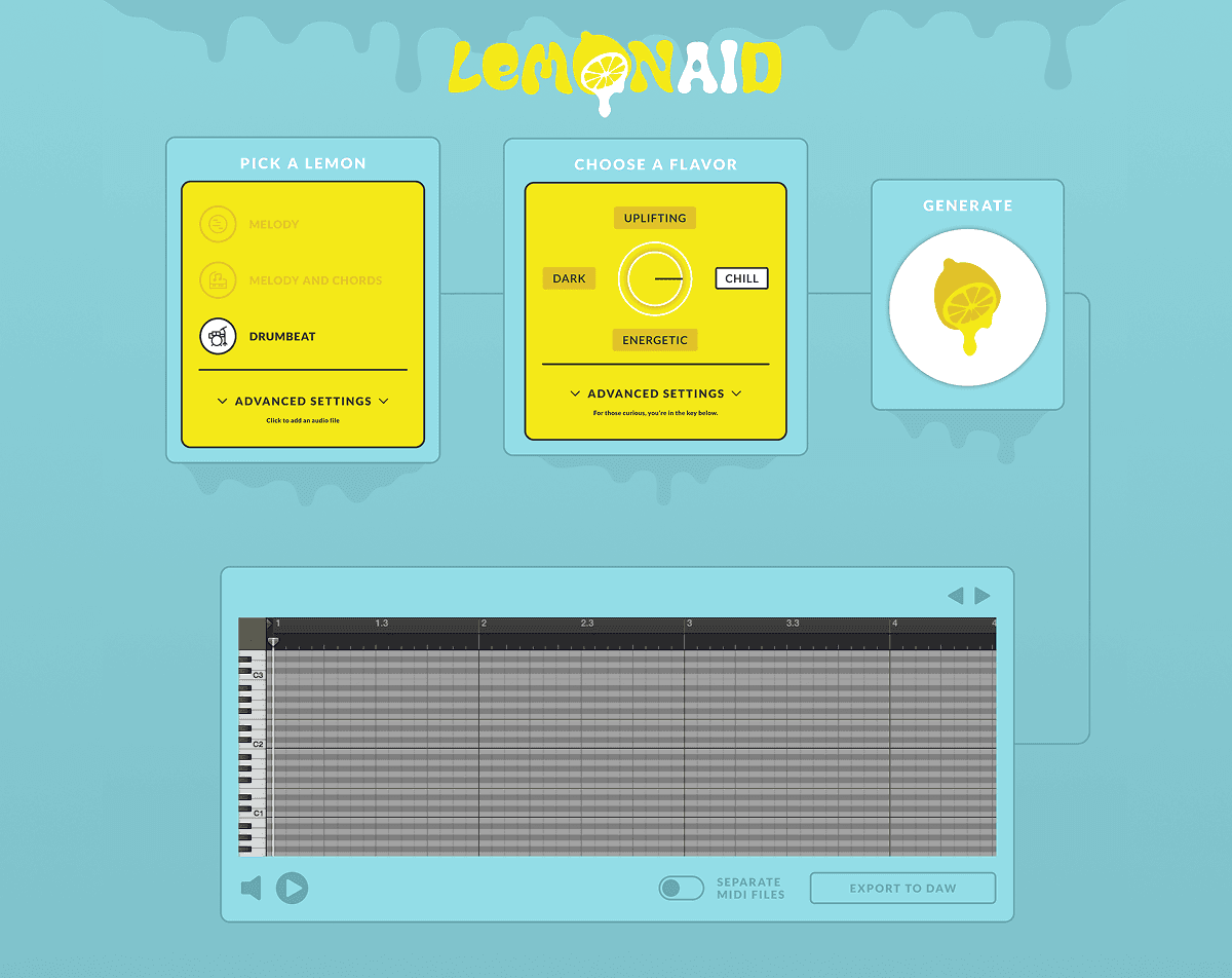 Early versions of Lemonaide featured a simple three-step process: users select a producer's style, input an idea, and generate a MIDI track. However, feedback from both beginners and professional producers showed a desire for more control and customization. To meet these needs, the interface evolved into a more sophisticated tool, both visually and functionally. With the priority still being on fun and creativity, the brand evolved with the tech. This required more complex patterns and controls for later versions, enabling users to generate, edit, and manipulate both MIDI and WAV files directly within the app, providing real-time adjustments.