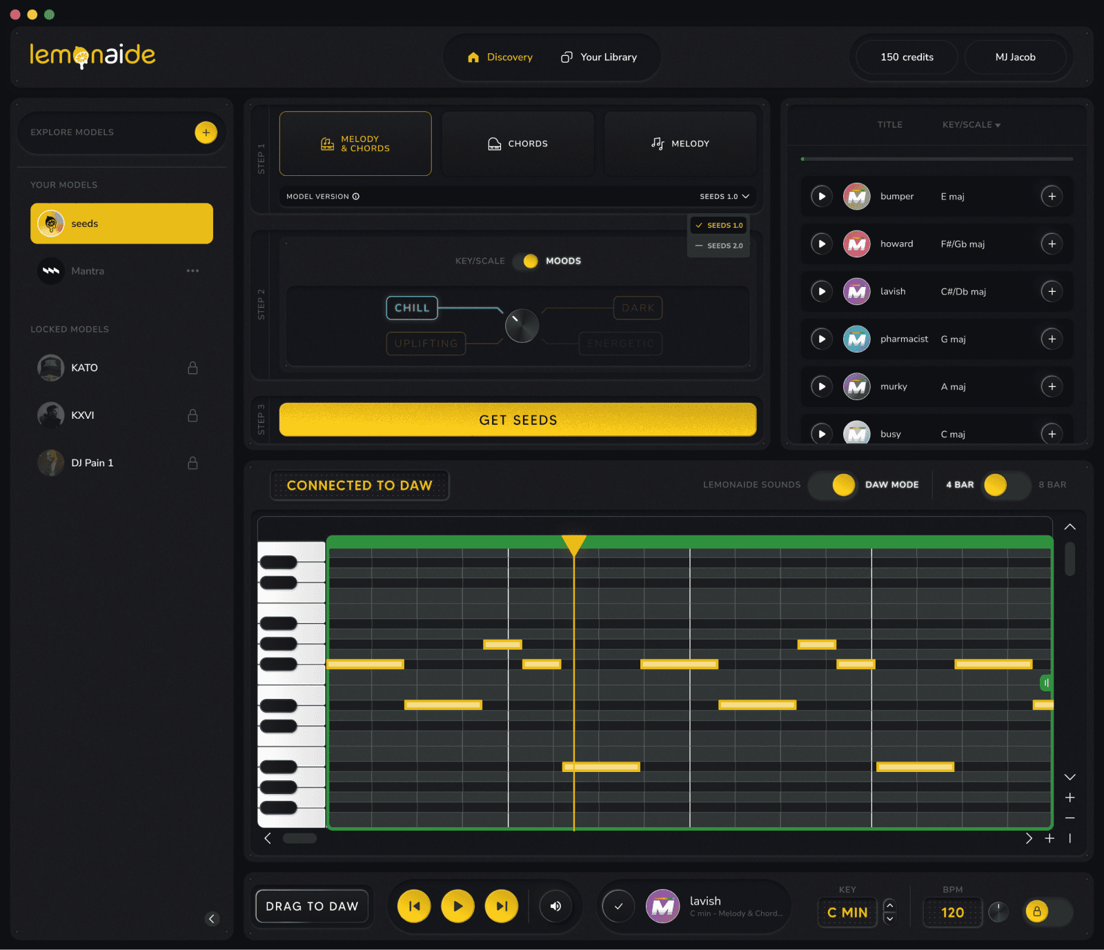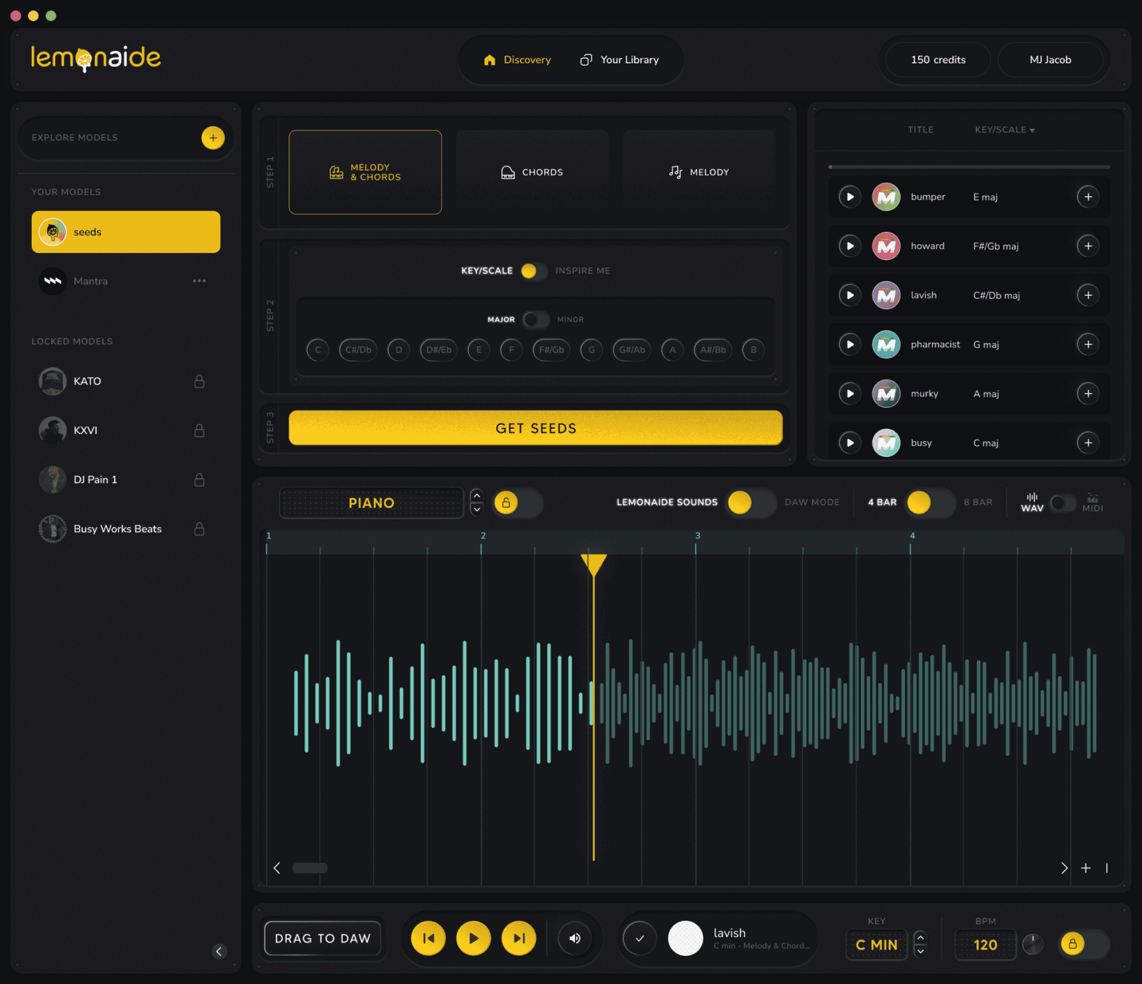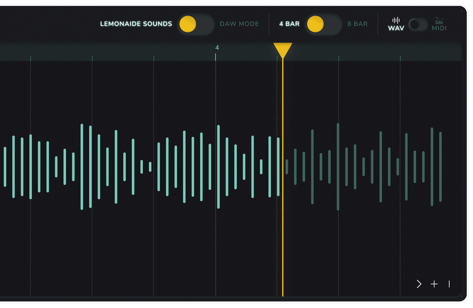 Early versions of Lemonaide featured a simple three-step process: users select a producer's style, input an idea, and generate a MIDI track. However, feedback from both beginners and professional producers showed a desire for more control and customization. To meet these needs, the interface evolved into a more sophisticated tool, both visually and functionally. With the priority still being on fun and creativity, the brand evolved with the tech. This required more complex patterns and controls for later versions, enabling users to generate, edit, and manipulate both MIDI and WAV files directly within the app, providing real-time adjustments.