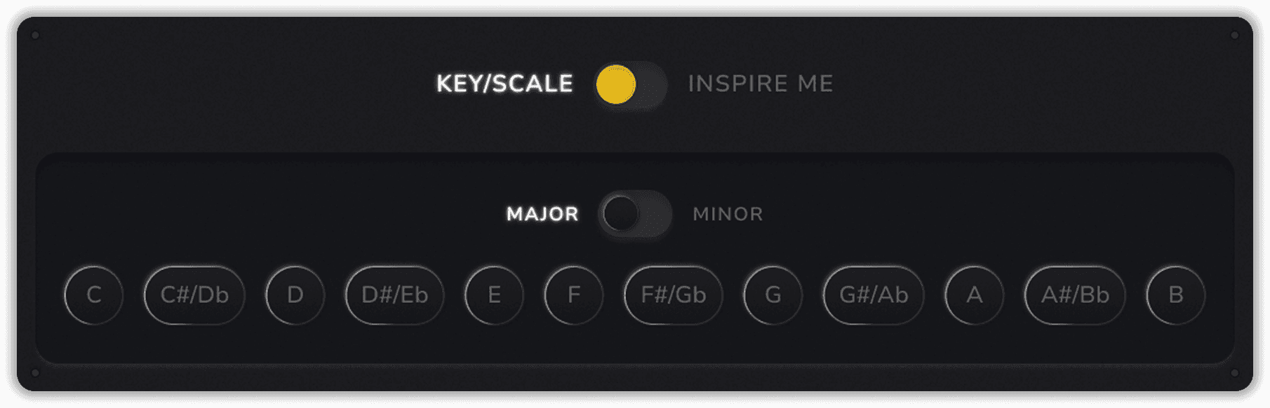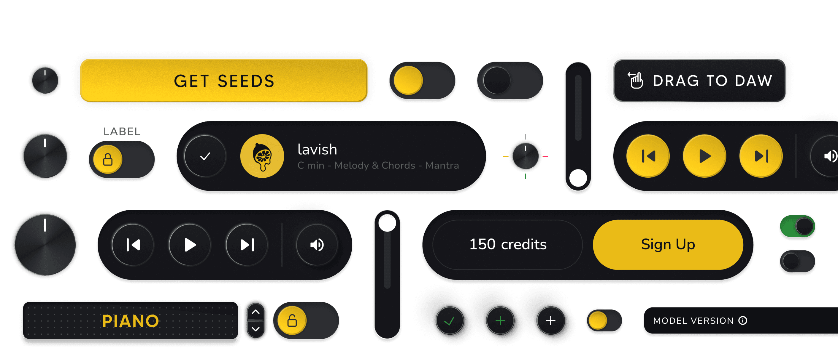 The request was to design something that feels like a digital AI tool, but emulates the look and feel of buttons, toggles, switches, and other tactile elements that a producer physically touches in a recording studio. Channeling back to my days of recording in studios and seeking inspiration from popular DAWs, I created a sleek, yet three-dimensional-looking tool that makes you feel like you're working with something more analog.