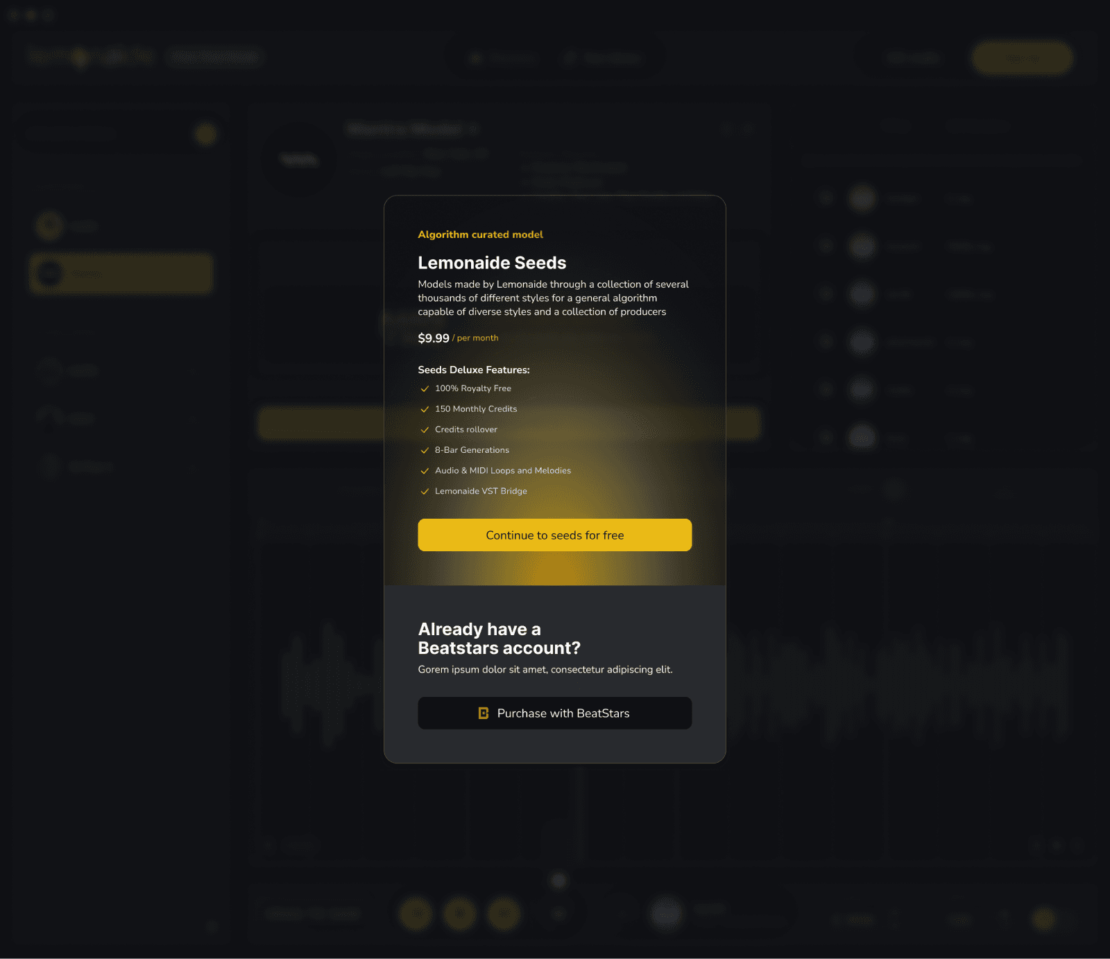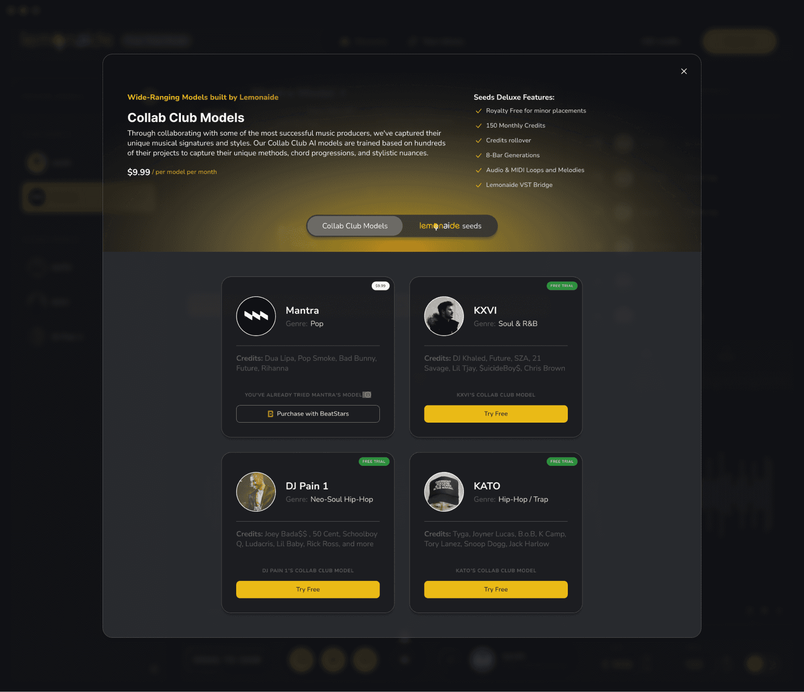 The app evolved and became more complex, necessitating the addition of modals, extra information, and paywall dependencies. Lemonaide integrated advanced features, such as drag-and-drop functionality, for easy use within industry-standard DAWs. This created the need for new "panels," button types, and visual cues.